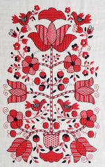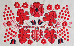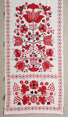 Рушник "Черницький" (Черкаська обл., Чигиринський р-н) вишитий нитками червоного і темно-синього кольорів в 2016 році. Орнамент - вазон з деревом, покрайниця геометрична. Серія «Повернення».