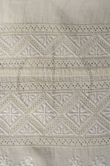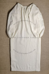 Сорочка жіноча додільна (Чернігівська обл.) вишита нитками білого кольору в 2013 році. Серія «Повернення». Орнамент рослинно-геометричний - ромби з зірками і хрестами, ламане гільце, безконечник.